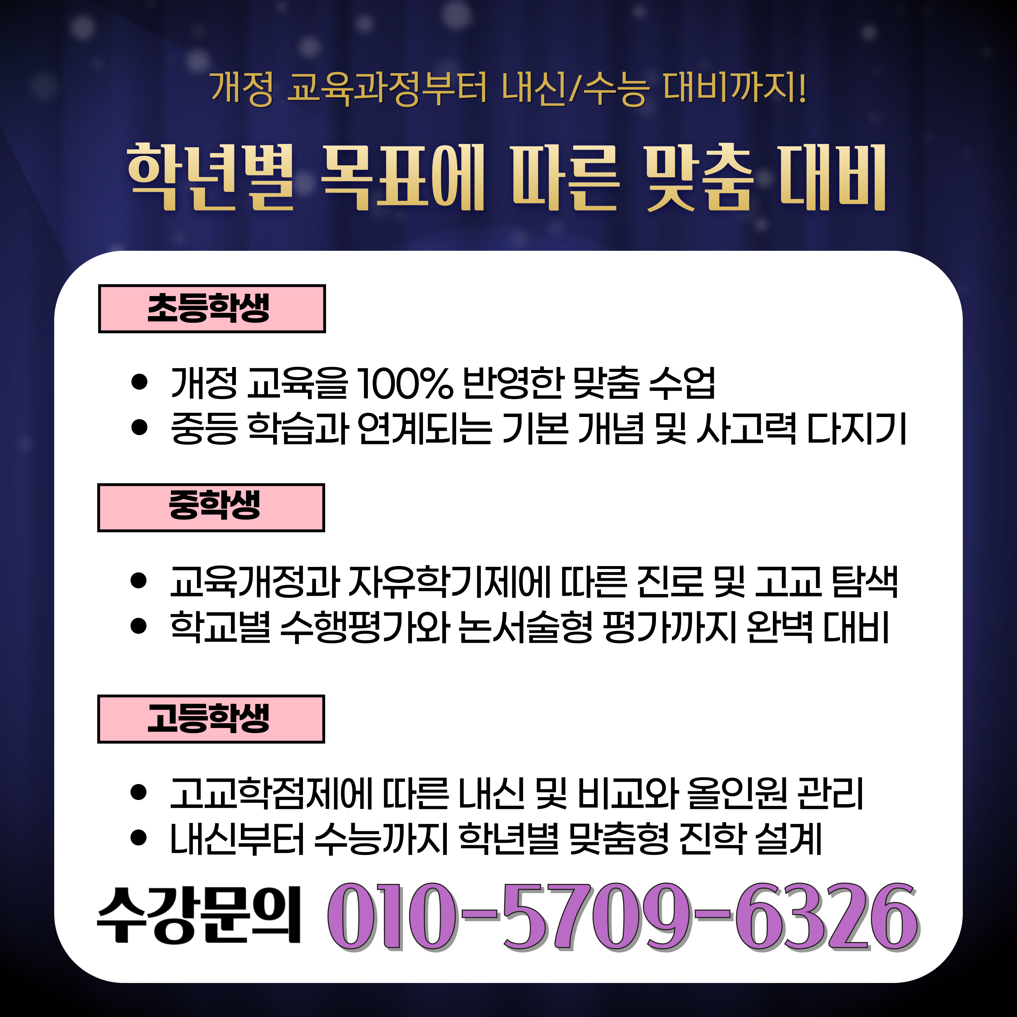 특히 학생 개개인의 약점을 파악해, 예를 들어 “일차함수 그래프 해석은 약하지만 계산력은 강한 학생”이라면 시각화 중심의 보충 수업을 진행합니다. 이런 맞춤형 전략이 점수 상승의 핵심입니다.